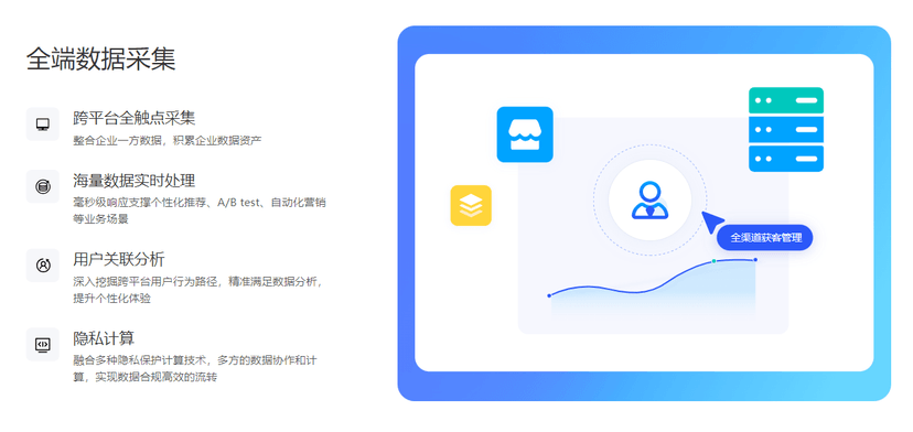 全端数据采集 跨平台全触点采集 整合企业一方数据,积累企业数据资产 海量数据实时处理 毫秒级响应支撑个性化推荐、A/B test、自动化营销等业务场景 用户关联分析 深入挖掘跨平台用户行为路径,精准满足数据分析提升个性化体验 隐私计算 融合多种隐私保护计算技术,多方的数据协作和计算,实现数据合规高效的流转