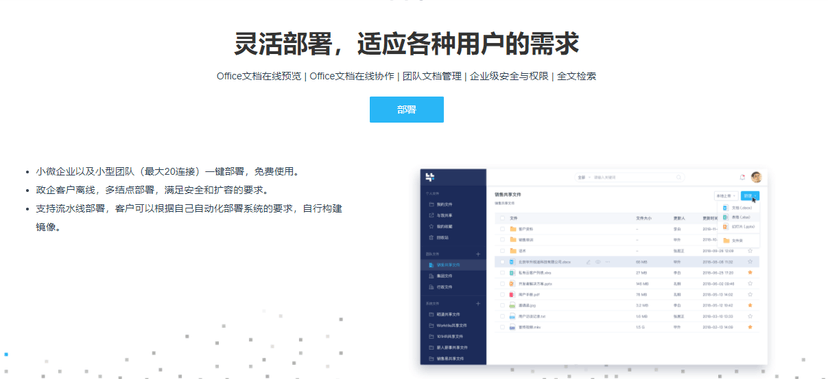 毕升Office创立于2018年,创始人团队来自于IBM、金山及微软,成员在Office领域长达10年的工作经验并且是国内最早从事web office研发的团队。主要业务是提供企业级云端 Office + 企业级文档解决方案解决企业文档数据的安全效率以及数据与业务系统融合问题。 毕升文档云平台包括drive和在线文件服务功能。其中drive实现文件的在线管理,组织结构权限,分享,团队协作等,文件的全文检索等功能;在线文件服务能够处理word,ppt,excel格式文件的带水印预览以及多人协同编辑,另外还能处理pdf,视频,音频文件的预览以及实现了100多种文本文件带语法高亮的预览。
