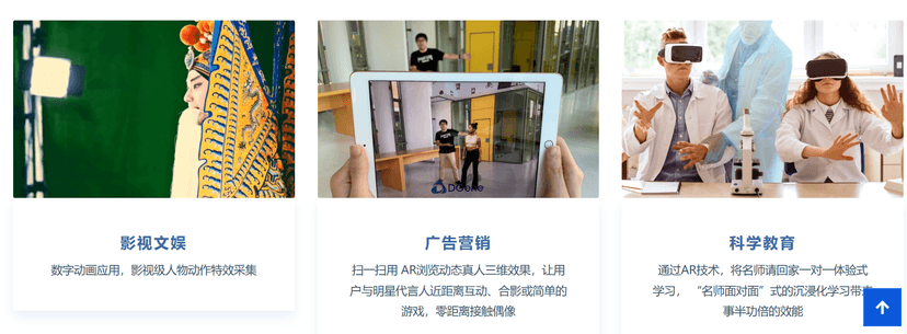 将全球顶尖的光场技术和智能视觉研究成果应用于创建虚拟数字人。全球顶尖,国内独一无二的虚拟数字人技术,能精准重现极其细微的身体动作。静态人物,瞬间采集人体数据,15s重建人体三维模型。高逼真还原立体形象。人脸3D视觉,融合深度学习,计算机视觉技术,对人脸进行影视级三维重建。 产品优势: 零干预全自动完成3D模型重建 通过精确的三维光场重建算法与人工智能技术实现零干预全自动,效率比传统工建模高数百倍 亚微米级超高精度还原 通过精确的三维光场重建算法与人工智能技术实现零干预全自动,效率比传统工建模高数百倍 光场渲染最真呈现 不仅重建物品的几何模型,还可以高品质重现不同视角下观看物品人体的光影效果 应用场景: 影视文娱 数字动画应用,影视级人物动作特效采集 广告营销 扫一扫用 AR浏览动态真人三维效果,让用户与明星代言人近距离互动、合影或简单的游戏,零距离接触偶像 科学教育 通过AR技术,将名师请回家一对一体验式学习, “名师面对面”式的沉浸化学习带来事半功倍的效能
