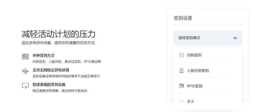 产品功能: 1、离线同步签到:多个签到设备在离线状态下通过局域网自动同步签到状态,签到快、数据准。 2、报名信息实时显示:在签到时可实时展示票种、票价及其他自定义的报名信息。 3、分场次签到:适用与大型活动多场次场景,支持不同场次不同地址不同时间分别签到。 4、RFID签到:签到设备自动识别,参与人员无需停留检票,让签到工作更简单智能。 5、人脸识别签到:签到入场只需刷脸,无更多繁琐步骤,签到准确快速。 6、扫码签到:下载多会签到 App 或使用多会服务号,主办方可免费使用扫码签到功能。 7、专用签到设备:提供专业的签到设备,让活动签到更快速。 8、胸牌打印:可为参与者打印胸牌,参与者信息一目了然,方便活动管理和互动。 9、展商信息收集:签到时可收集客户信息,方便展商收集访客信息。 产品优势: 1、减轻活动计划的压力:适应多种活动场景,提供所需要的签到方式。 2、提升与会者的入场体验:为参与者提供智能、快速的签到体验。 3、为参展商提供更多客户:扫描二维码即可记录访客信息,积累更多潜在客户。