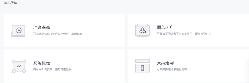 基于业内先进的NLP技术,提供丰富的文本分析能力,包括文章关键词提取、文章摘要生成、文章情感倾向分析、文本纠错等,可应用于个性化推荐、话题聚合、文章搜索等场景。 -准确率高:可准确从各维度进行文本分析,准确率高。 -覆盖面广:可覆盖不同场景下的文章类型,覆盖类型广泛。 -服务稳定:高可用架构支撑,服务稳定性强。 -支持定制:可根据指定场景进行定制。