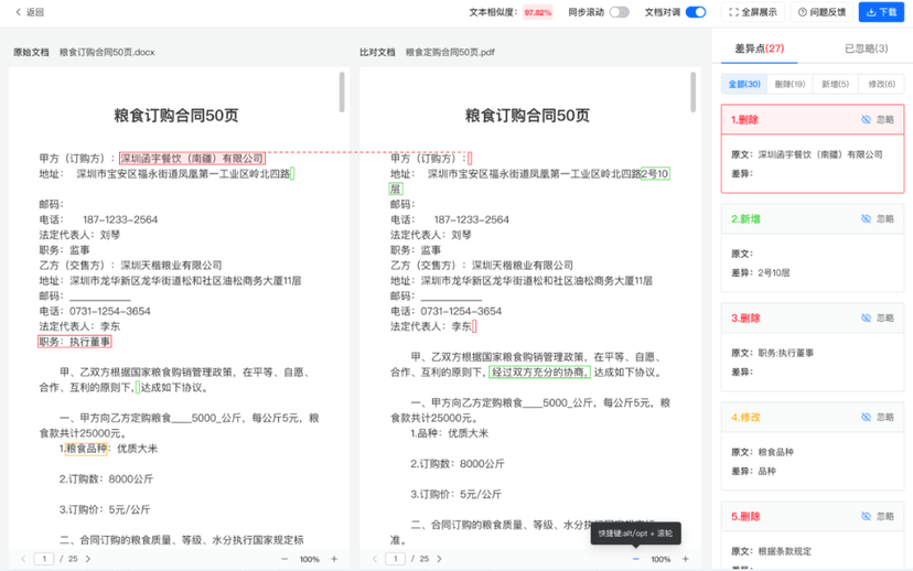 火眼审阅依托自研NLP、OCR识别技术,能够识别不同格式文档,自动读取内容、解析结构、比较文字差异,审查内容潜在风险