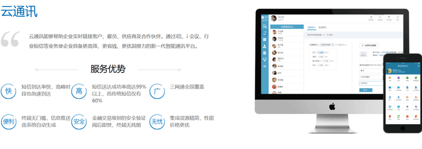 云通讯能够帮助企业实时链接客户、雇员、供应商及合作伙伴。通过i信、i 会议、行业短信等业务使企业具备更高效、更省钱、更优洞察力的新一代智能通讯平台。 中国自主SaaS行业从业者,本着诚信责任的原则,致力于颠覆传统软件行业的服务模式,提供互联网软件服务。自公司i到位云平台上线以来,秉承“ 让管理更到位”的品牌口号,积极推动理念、产品、技术、营销等全方位创新,为用户提供优质、稳定、高效的专业服务体验,致力于让客户便捷、高效、更好性价比地运营管理和服务。目前,i到位已成功构建了包含云通讯、云管理、云营销等业务在内的下一代企业核心系统 ,促进SaaS商业模式的全面发展。 产品优势: 短信到达率快,高峰时段也急速到 达短信送达成功率高达99%以上,而传统短信仅有60% 三网通全国覆盖 主要功能: i信 企业定制的模板信息通过接口方式推送至用户手机上,如:订单、验证码、银行卡刷卡提醒等关键信息。基于信令网发送信息,实时/安全,不易拦截,成功率高 企业短信 企业的客户关怀、会员服务、注册/支付验证码下发,三网支持,三大运营商专属通道。 视频会议 电信运营商级通话质量、VOIP的价格,高清流畅的音视频,简 单易用。 三网 通话支持,多方不限制