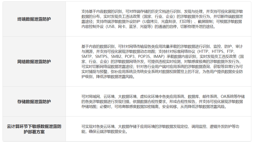 为客户的数据资产提供“梳理、识别、发现、感知、监控、防护、审计”等多维角度全方位的泄漏监控与保护