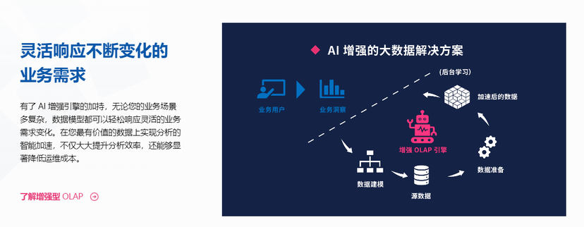 Kyligence Enterprise 基于 Apache Kylin 核心,提供 PB 级数据集上亚秒级标准 SQL 查询响应,同时支持互联网级的高并发访问,助力业务用户快速发现海量数据中的业务价值,驱动商业决策。 其 AI 增强引擎,通过学习用户的分析行为及数据特征,自动完成数据模型的准备和优化,智能沉淀数据资产,显著提高数据工程师和分析师的工作效率。