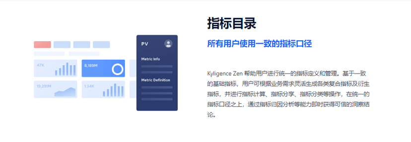 Kyligence Zen 是基于 Kyligence 的核心 OLAP 能力打造的一站式指标平台。结合 Kyligence 多年来为金融、零售、制造等行业客户落地指标平台的丰富实践经验,Kyligence Zen 旨在解决企业面临的指标管理、分析和应用痛点,帮助企业构建数字化管理体系,实现指标驱动的管理与决策。 通过其低代码的指标服务,人人都可以敏捷地利用指标开展工作。