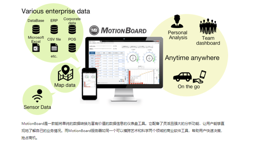 MotionBoard是一款能将单纯的数据转换为富有价值的数据信息的仪表盘工具。它配备了灵活且强大的分析功能,让用户能够直观地了解自己的业务情况。 MotionBoard服务器如同一个可以横跨艺术和科学两个领域的商业软件工具,帮助用户快速决策,抢占商机。 motionboard允许用户在一个单一的仪表盘创建来自不同数据源的图表。各种企业信息(如财务信息、销售信息、物流信息等)都可以在仪表板上显示,并且用户无需具备编程知识就能轻松创建各种数据图表。 Analytics分析功能:简单而丰富的分析功能、图表、数剧模拟、GEO功能、Layer Chart图层