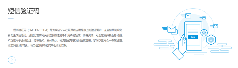 5G消息通信服务能力支持全网络环境,结合丰富的行业应用场景,满足企业和用户之间的信息沟通需求和多样化的服务需求,助力行业客户和用户建立起更便捷的信息服务和更紧密的沟通联系。 产品功能: 1、企业短信:基于运营商网络,面向广大用户的功能全面的跨平台短信通知发送服务。 2、视频短信:基于WAP-PUSH技术,集成视频、语音、图片、文字、短链、二维码等消息通讯能力的富媒体信息,通过运营商专用网络,直达手机原生应用——短信箱,最大可发送30S视频或10张高清图片等富媒体信息。 3、5G消息:基于全球移动通信协会RCS和UP标准构建,实现消息的多媒体化、轻量化,通过引入MaaP(消息即平台)技术实现行业消息的交互化。 4、短信验证码:为响应个人在网页或应用程序上的验证需求,企业按预制规则自动生成验证码,通过运营商网关发送到指定的手机用户的短信。 5、语音验证码:将验证码利用自动识别技术,通过语音电话直接呼到用户手机,从而实现电话语音播报验证码的一种新型验证方式。