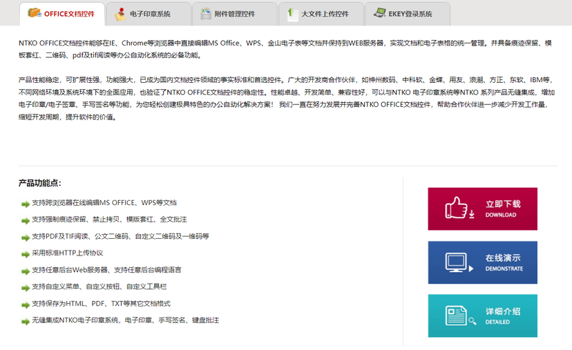 NTKO OFFICE文档控件能够在IE、Chrome等浏览器中直接编辑MS Office、WPS、金山电子表等文档并保持到WEB服务器,实现文档和电子表格的统一管理。并具备痕迹保留、模板套红、二维码、pdf及tif阅读等办公自动化系统的必备功能。 NTKO 电子印章系统系列产品,可以支持在MS Office、WPS、WEB、PDF等电子文档智能手机、移动设备表单上实现电子印章/电子签章、手写签名、手写签批、键盘批注等安全电子印章常用功能。 NTKO 附件管理控件,能够一次上传多个文件或一次扫描多页文件上传至WEB服务器,避免了传统WEB系统每次只能选择一个文件上传的低效率操作。并支持在浏览器中启动原始文件对应的应用程序对文档进行编辑、阅读。 NTKO大文件上传控件,采用多线程技术,提供专业的大文件上传解决方案,是国内唯一支持断点续传上载的控件。可以轻松迅速将10G甚至更大的文件上传到web服务器。 NTKO EKEY登录系统,能够将用户名、口令、自定义数据保存在EKEY中,并在登录时,将用户名、口令,以及EKEY序列号(可选)或者数字证书信息作为验证因子自动登录到OA等管理系统,提高信息系统的安全性。