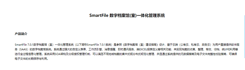 基于云端(公有云、私有云、政务云)为用户直接提供软件服务(SAAS)的数字档案馆系统。系统通过强大的自定义表单、工作流引擎、消息提醒、即时通讯服务、类EXCEL报表定义等相关功能,来实现档案的收集、整理、移交、归档、统计和利用等进行全过程信息化管理。 采用SOA架构及分级授权管理机制,可以满足不同地域档案的集中式或分布式规范化管理,并且通过系统提供的元数据策略及电子文件完整性校验策略,可确保电子文件的长期保存与利用。 产品特点:极致自定义、极简操作方式、全新的屏幕响应式JS框架、数据库高速引擎技术、高性能在线归档接口服务、可扩展的档案信息应用模式、基于元数据的档案信息包引擎技术、可自定义的工作流引擎技术、动态水印、在线编研、轻量级JS电子文件阅读器。