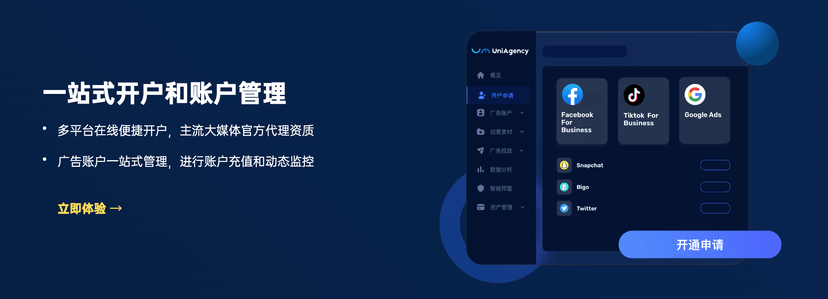 钛动科技旗下出海营销一站式服务平台,提供全链路解决方案,媒体开户+账户充值+广告投放+数据聚合分析。 出海营销一站式解决方案: 媒体无忧服务 您能享受由主流大媒体平台代理提供的开户、账户管理、媒体资讯服务 高效广告营销工具 您能高效实现业务目标,几步制作创意素材,简单高效投放广告,轻松衡量广告效果 商业智能算法 您能实现精准营销且持续发展,基于大数据技术抽样沉淀的智能优化策略推荐