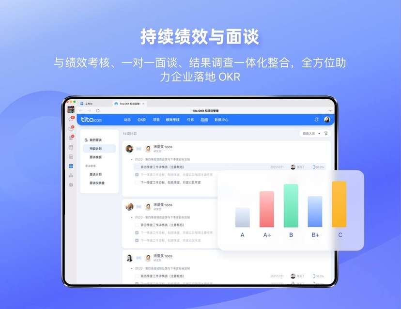 Tita 一直专注于企业一体化工作协同管理 SaaS 领域,目前已形成完整、成熟的管理业务体系。 依据 PDCA 管理理论,Tita 提供了完整工作生命周期闭环管理服务,为客户提供 SaaS 模式的企业一体化工作协同管理解决方案。同时,Tita 推出 OKRs-E目标管理应用框架,帮助企业战略高效敏捷落地,引领企业迈上成功之路。 · OKR 与 绩效考核管理 Tita 通过 OKR 目标管理、敏捷项目任务管理,结果的绩效考核,提供持续过程反馈,激发员工潜能,实现企业高速增长,带领企业拥抱人员管理新时代! · OKR 案例库/绩效考核模板 Tita 宝典为你提供上千套 OKR 案例,全行业的绩效考核模板随心选。 · OKRs-E,将企业战略转化为成果 OKRs-E:是一个完整的目标管理框架,包含目标制定、目标达成检验,以及达成关键成果的具体计划执行。 · Tita 项目管理 从里程碑、甘特图、项目看板和过程协同,多维度提供高效敏捷的项目管理。 · Tita 绩效考核 结合 OKR、KPI、360 等多种绩效评估场景,提供简单、敏捷高效的绩效流程管控。