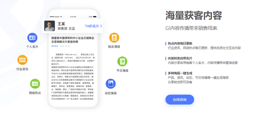 智能名片,社交场景销售拓客工具。智能销售名片,全面展示企业及个人信息。个人信息展示,自定义名片内容,全方位规范化展示个人信息与介绍,提升客户信任度。小程序官网,拖拽式搭建企业小程序官网,客户便捷查看视频、介绍、案例、资讯等多维信息。企业产品展示,企业产品按需分类展示,图文并茂方便客户快速了解产品详情。