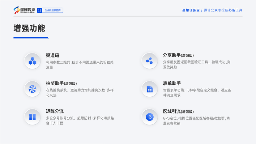 星耀任务宝粉丝裂变增长系统是基于微信公众号的营销插件,传播原理通过奖励式分享传播,帮助商家进行品牌推广实现粉丝快速增长,是一款微信公众号运营必备的增粉工具。 用户邀请的好友通过关注公众号,生成专属海报,如果对活动奖品感兴趣则会继续分享转发海报,形成裂变循环。