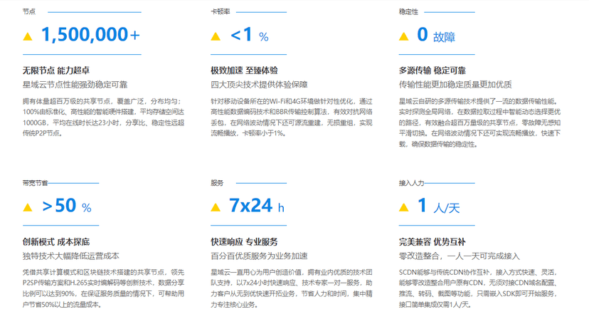 旗舰版:完全依托独创的百万量级共享节点搭建的分布式内容分发网络,为客户提供无限节点、星域调度、动态防御、弱网加速等顶尖技术,用户通过SDK接入服务后,配合自身已有第三方CDN共同进行加速服务,可以有效优化CDN加速能力,大幅降低带宽成本,在直播、点播、大文件下载等业务场景中优势显著。 产品特点:无限节点、星域调度、动态防御、弱网加速、便捷兼容 极速版:依托独有百万量级无限节点进行全网探测,采用HTTP302重定向为调度方式的辅助CDN服务模式,配合星域调度、动态防御等核心技术,与用户已有的第三方CDN共同进行优质内容分发及加速服务。还支持提供接口、功能、数据等定制化服务,适用于直播、点播、下载等场景。 产品特点:优质资源、创新技术、优化成本、专业服务