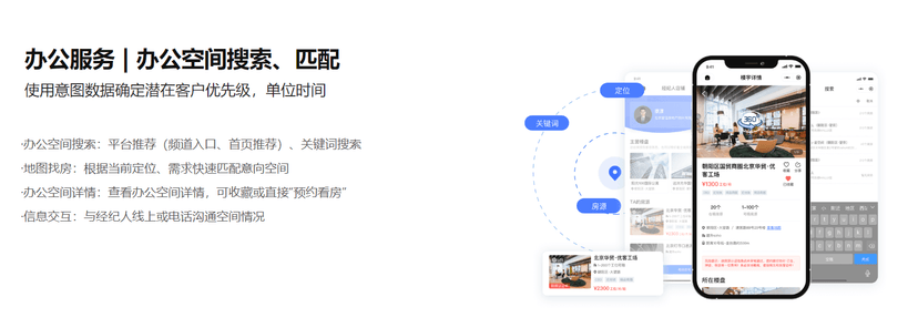 速读网以空间为核心,为业主、经纪人提供免费发布空置资源的平台并提供获客渠道,致力于对租赁双方需求数据进行智能化匹配,达成意向撮合,让企业办公选址更高效,并依托强大的平台资源优势,通过提供知识产权、法律服务等企业服务,更好的赋能企业用户,以此形成生态业务战略,全面布局办公选址和商办产业服务。 办公服务 | 办公空间搜索、匹配 使用意图数据确定潜在客户优先级,单位时间 ·办公空间搜索:平台推荐(频道入口、首页推荐)、关键词搜索 ·地图找房:根据当前定位、需求快速匹配意向空间 ·办公空间详情:查看办公空间详情,可收藏或直接“预约看房” ·信息交互:与经纪人线上或电话沟通空间情况