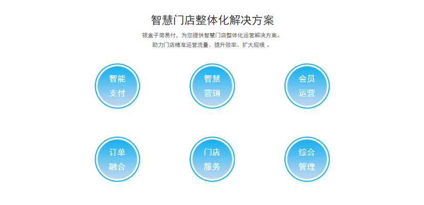 银盒子简易付,为您提供智慧门店整体化运营解决方案。 助力门店精准运营流量、提升效率、扩大规模 。 产品优势: · 智慧门店整体化 简易付融合线上门店、外卖平台、扫码点餐等线上订单渠道。 系统自动接单,直达后厨。 · 支付核销一体 营销高效执行 支持核销各类线上优惠券、会员权益,支持支付积分,顾客电子支付时,即可享受优惠,门店活动轻松执行。 · 融合各大平台 订单整合接入 简易付融合线上门店、外卖平台、扫码点餐等 线上订单渠道。系统自动接单,直达后厨。 · 云端会员系统 “千人千面”精准营销 简易付端支持会员注册、一键开卡,现场充值 、注销等操作。 结合后台强大的大数据会员标签,可开展精准会员营销活动。