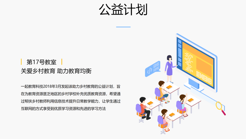 一起教育科技2018年3月发起该助力乡村教育的公益计划,旨在为教育资源匮乏地区的乡村学校补充优质教育资源,希望通过帮扶乡村教师利用信息技术提升日常教学能力,让学生通过互联网的方式享受到优质学习资源和先进的学习方法