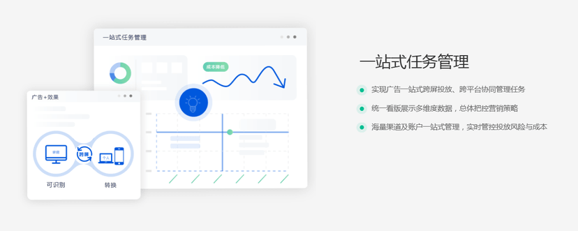 提高运营效率,节约投放成本,实现ROI最大化 整合 海量渠道及账户一站式管理,实现目标受众理解及触达, 跨平台协同管理,降低沟通成本 效率 AI自助托管:自动执行、运营、分析、监测复杂的投放项目 批量快捷工具:多平台操作一键下发,报表数据实时更新 效果 一站式跨平台流量对接,实时监控媒介投放效果, 充分运用智能算法,智能预估并监测广告创意效果 安全透明 媒体中立:不经手媒体费用,完全从用户立场优化活动效果 成本透明:媒体成本透明,直接对接平台数据