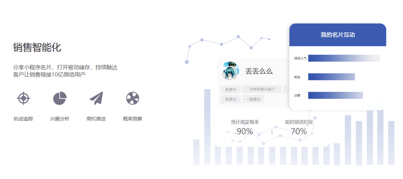 智能AI——新销售:智能名片轻松获客、AI智能助力客户分析、智能模式快速成交、大数据分析智能管理、客资锁定轻松获客。 销售社交化:分享小程序名片,打开被动储存,持续触达客户让销售链接10亿微信用户。 销售简单化:智能销售测算成率,销售高效跟进,形成销售沙漏,最终客资沉淀。 销售人人化:微信名片全员开通,当市场约见客户、当运营约见商业伙伴、当...各个场景都可分享微信名片,让全公司社交流量变现。