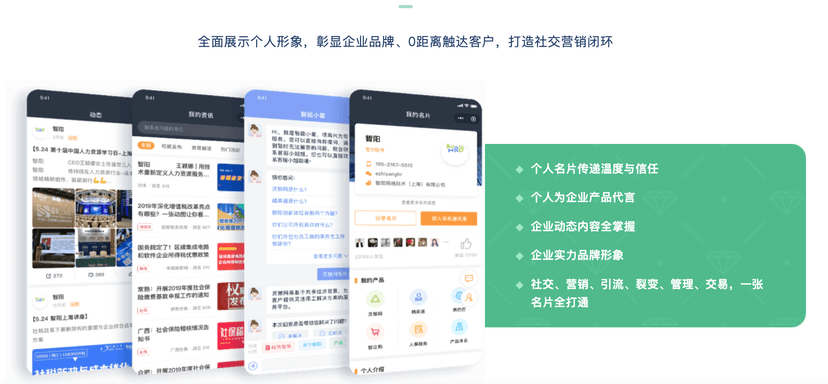 全流程打造更高效、更智慧的微信营销管理,社交、营销、引流、裂变、管理、交易、一张名片全打通。 产品价值: 全面展示个人形象,彰显企业品牌、0距离触达客户,打造社交营销闭环 产品优势: 实现企业人人营销,10亿微信用户直接触达,全员流量导入小程序。 大幅降低企业获客和管理成本,AI社交裂变福袋,自动搜索N度人脉,降低成本,精准获客。 全方位提升企业营销效率及营销能力,构建客户标签系统,基于客户标签分类推送,高效管理,精准跟进。