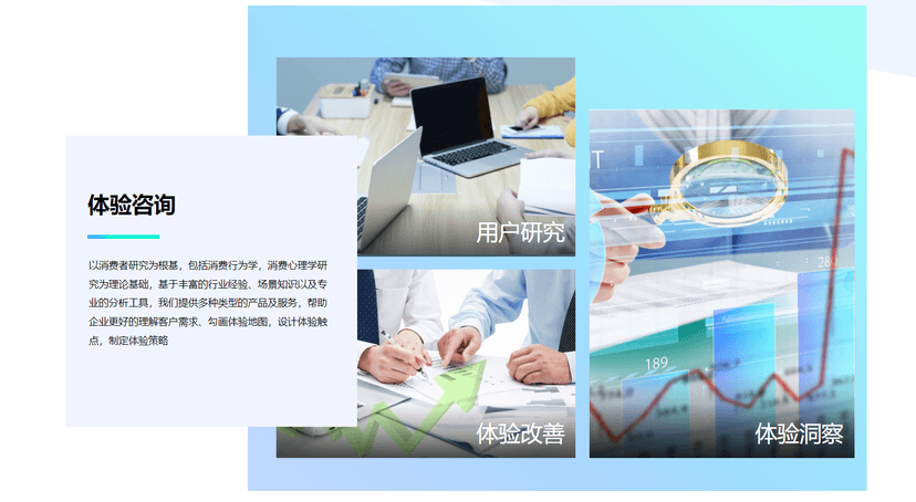 以客户洞察能力,认知智能技术和行业know-how为基础,形成企业数字化转型的新基建,帮助众多企业落地卓有成效的客户体验战略。 以消费者研究为根基,包括消费行为学,消费心理学研究为理论基础,基于丰富的行业经验、场景知识以及专业的分析工具,我们提供多种类型的产品及服务,帮助企业更好的理解客户需求、勾画体验地图,设计体验触点,制定体验策略。